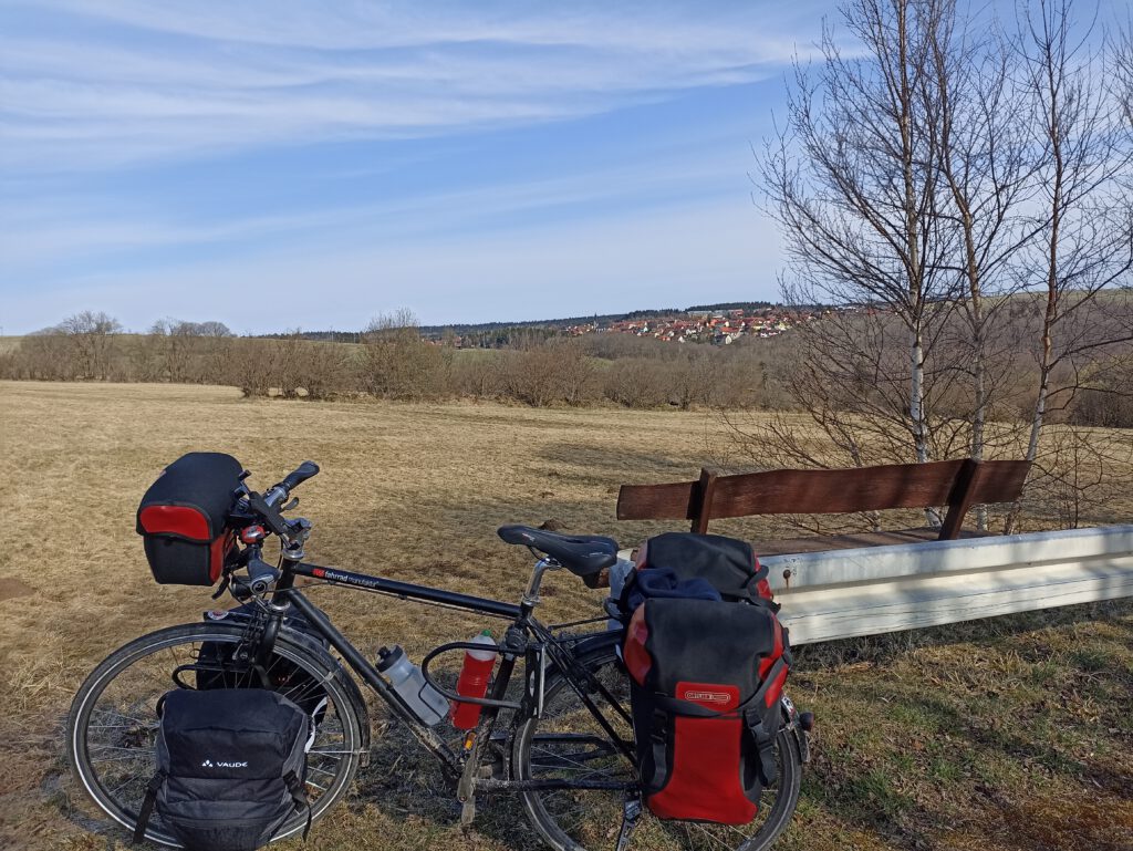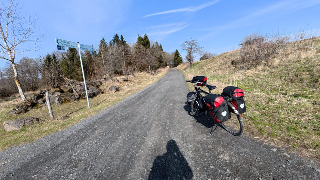 Nach einer sehr erholsamen Nacht startete ich auf die nächste Etappe, nachdem ich beim örtlichen Bäcker und Metzger für Proviant gesorgt hatte. Der erste Anstieg, vermutlich der Schwerste auf der Tour, lies nicht lange auf sich warten. Sehr lange schob ich meine Fahrrad den Wald hinauf. Belohnt wurde ich aber mit einer herrlichen Aussicht.