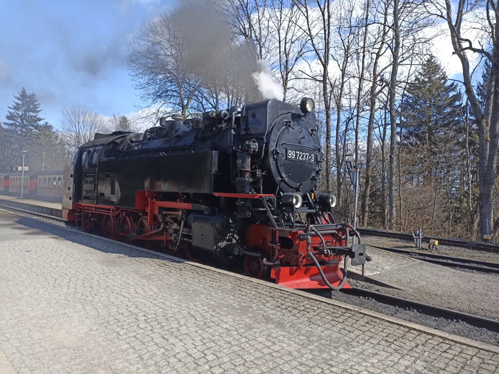 In Drei Annen hatte ich das Glück Fotos mit zwei Damploks machen zu können. Es fuhr gerade ein Sonderzug hoch zum Brocken, der die Fahrgäste zur Faust-Aufführung brachte. Mein Vorteil war, dass die Passagiere natürlich alle wieder einsteigen mussten und ich so niemanden im Weg stehen hatte, um in Ruhe Fotos von mir mit Fahrrad vor dem Zug zu machen.