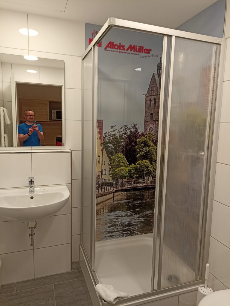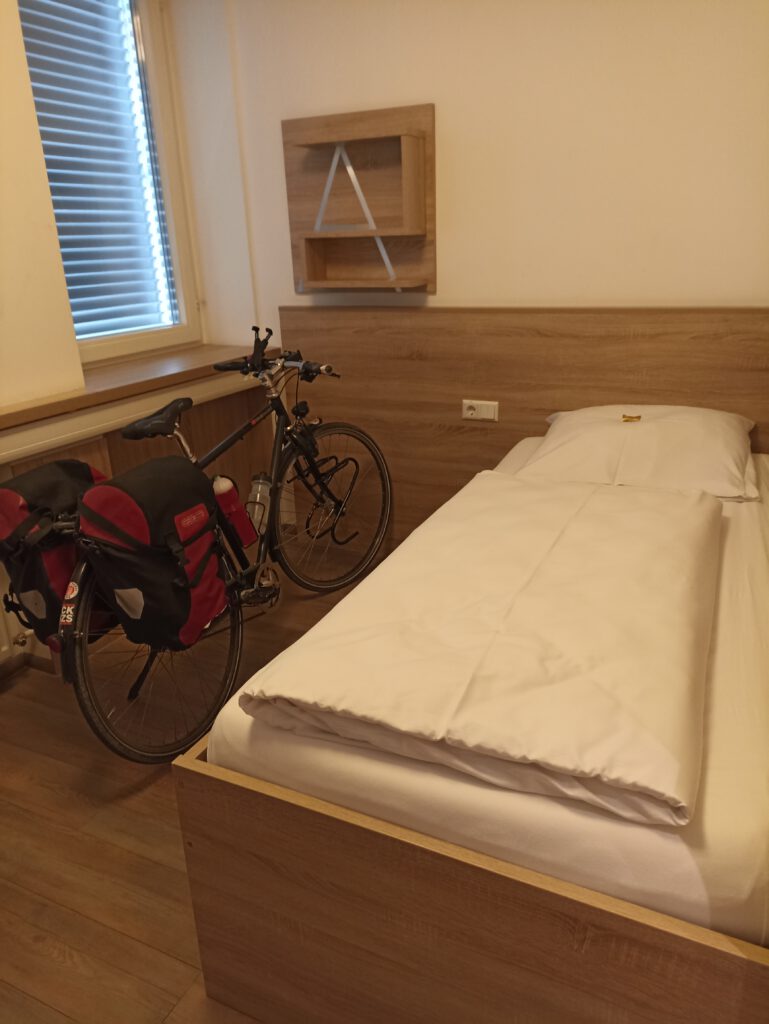 Meine Unterkunft in Kempten ist das A2 Boardinghouse, aus den Bewertungen entnahm ich, dass es sich hierbei wohl um das ehemalige Gebäude des Arbeitsamtes handelt (das aktuelle Arbeitsamt befindet sich nun auf der gegenüberliegenden Straßenseite). Die Einrichtung des Zimmers ist sehr minimalistisch gehalten, es ist aber sehr sauber und neuwertig. Neben meinem Bett ist ausreichend Platz für mein Fahrrad, welches ich mit auf Zimmer nehmen durfte. Quasi Einzelzimmer mit Doppelbelegung.